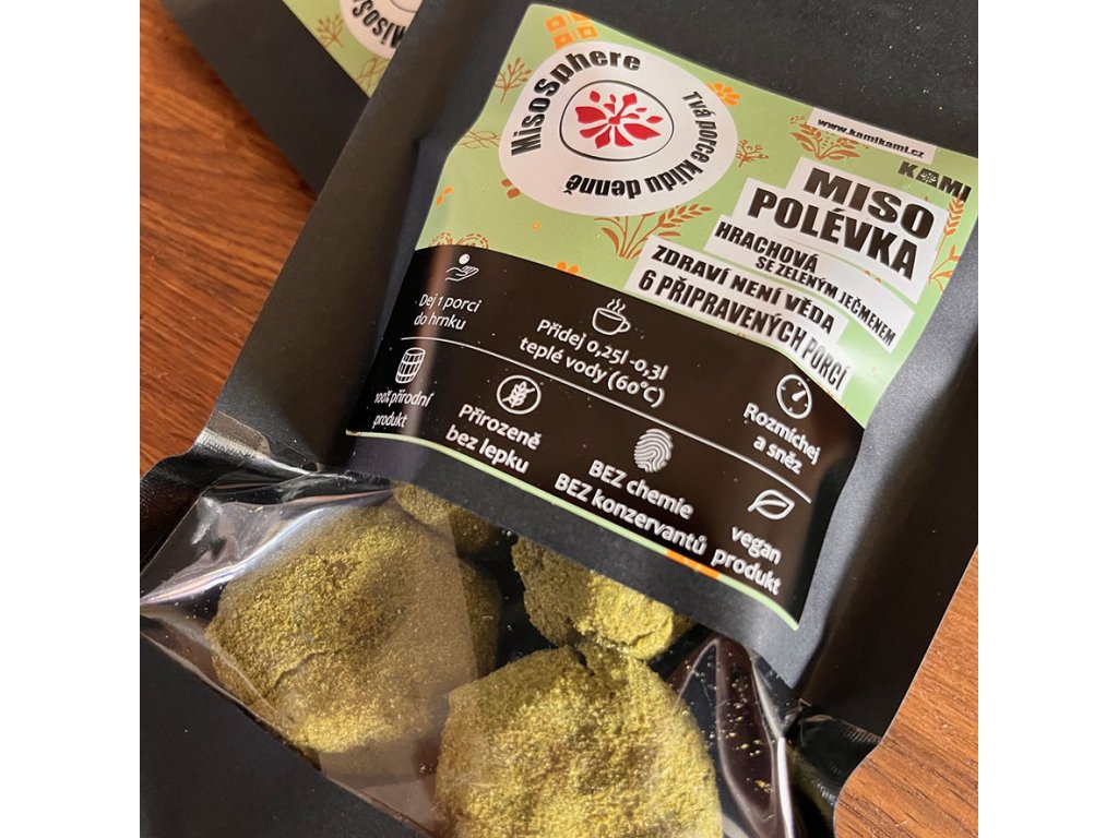 Stačí přilít teplou vodu a rozmíchat. Za pár minut je to hotové a v bříšku jako v pokojíčku. Složení si zachovává všechny pozitivní přínosy fermentované stravy na podporu trávení a střevního mikrobiomu. Základ tvoří naše misa zrající v dřevěném sudu. Misa jsou různě stará a z různých luštěnin (hrách, cizrna). Kombinací několika mis dosahujeme optimální chuti. Samozřejmě je ve finále přidáno i koření a zelenina.